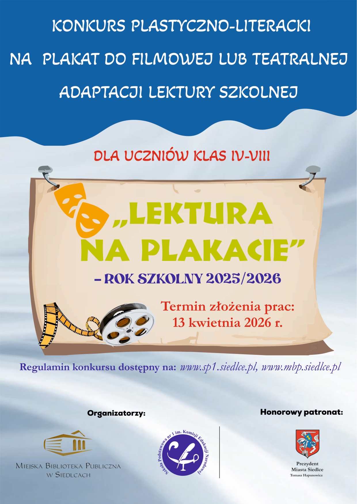 Zapraszamy do udziału w konkursie plastyczno-literackim „Lektura na plakacie”, którego celem jest stworzenie plakatu do filmowej lub teatralnej adaptacji wybranej lektury szkolnej.