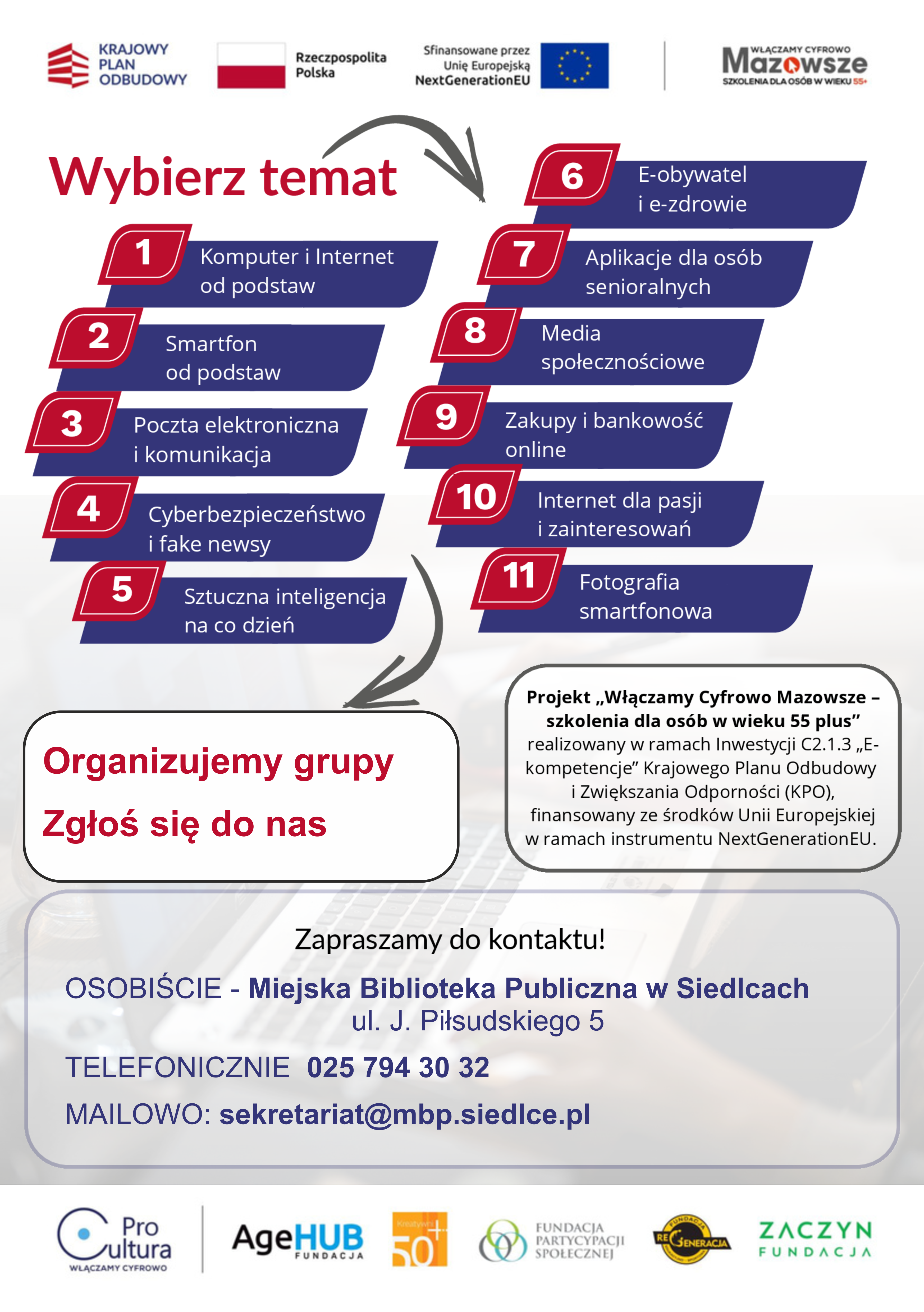 Szkolenia organizowane są w ramach projektu „Włączamy Cyfrowo Mazowsze 55+” i jest realizowany przez mazowieckie organizacje pozarządowe w tym – Fundację Zaczyn, Fundację Age Hub, Fundację Pro Cultura (lider partnerstwa). Projekt jest finansowany ze środków Krajowego Planu Odbudowy.