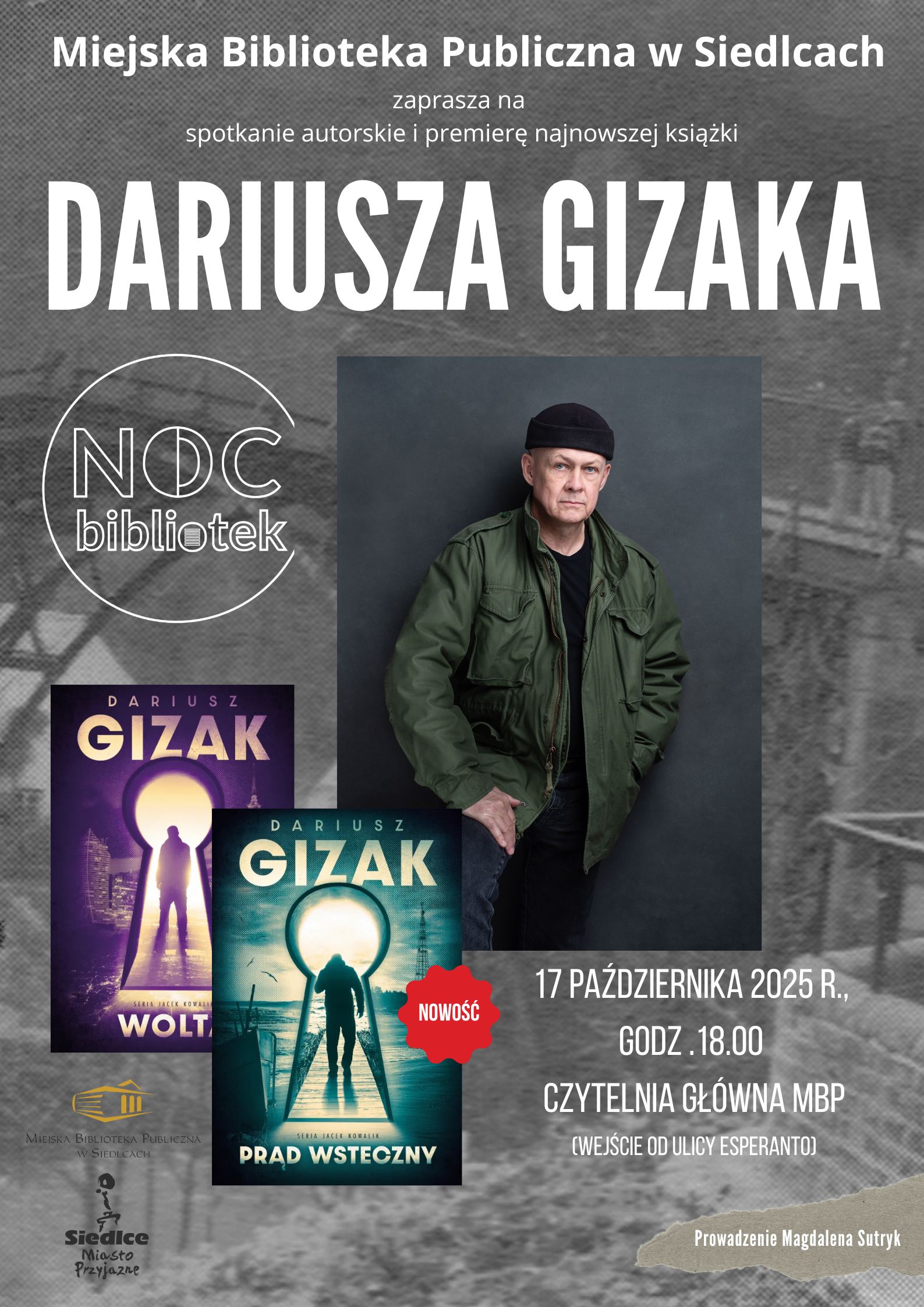 Tegoroczną Noc Bibliotek w Miejskiej Bibliotece Publicznej w Siedlcach spędzimy z Dariuszem Gizakiem - siedlczaninem, autorem kryminału "Wolta" oraz fabularyzowanego zapisu przeżyć autora podczas służby w plutonie specjalnym milicji pt. "By(i)łem w ZOMO. Tajemnice plutonów specjalnych milicji".