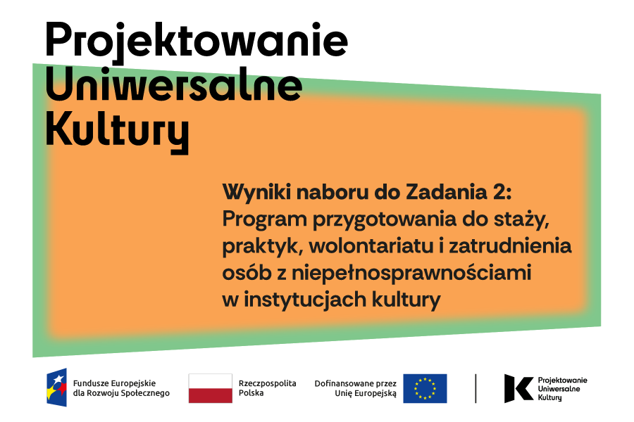Zadanie 2 “Program przygotowania do staży, praktyk, wolontariatu i zatrudnienia osób z niepełnosprawnościami w instytucjach kultury“ jest realizowane w ramach projektu “Projektowanie Uniwersalne Kultury – Dostępność w Instytucjach Kultury”, który podejmuje temat dostępności i włączania osób z niepełnosprawnością oraz seniorów w działania instytucji kultury. Partnerem projektu jest Państwowy Fundusz Rehabilitacji Osób Niepełnosprawnych. Przedsięwzięcie jest finansowane ze środków Unii Europejskiej w ramach działania 3.3 “Systemowa Poprawa Dostępności” Priorytetu III “Dostępność i Usługi dla Osób z Niepełnosprawnościami” Programu Fundusze Europejskie dla Rozwoju Społecznego 2021-2027.
