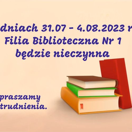 W dniach 23-26.09.2025 r. Filia Biblioteczna nr 1 i Filia Biblioteczna nr 5 będą nieczynne. Przepraszamy.