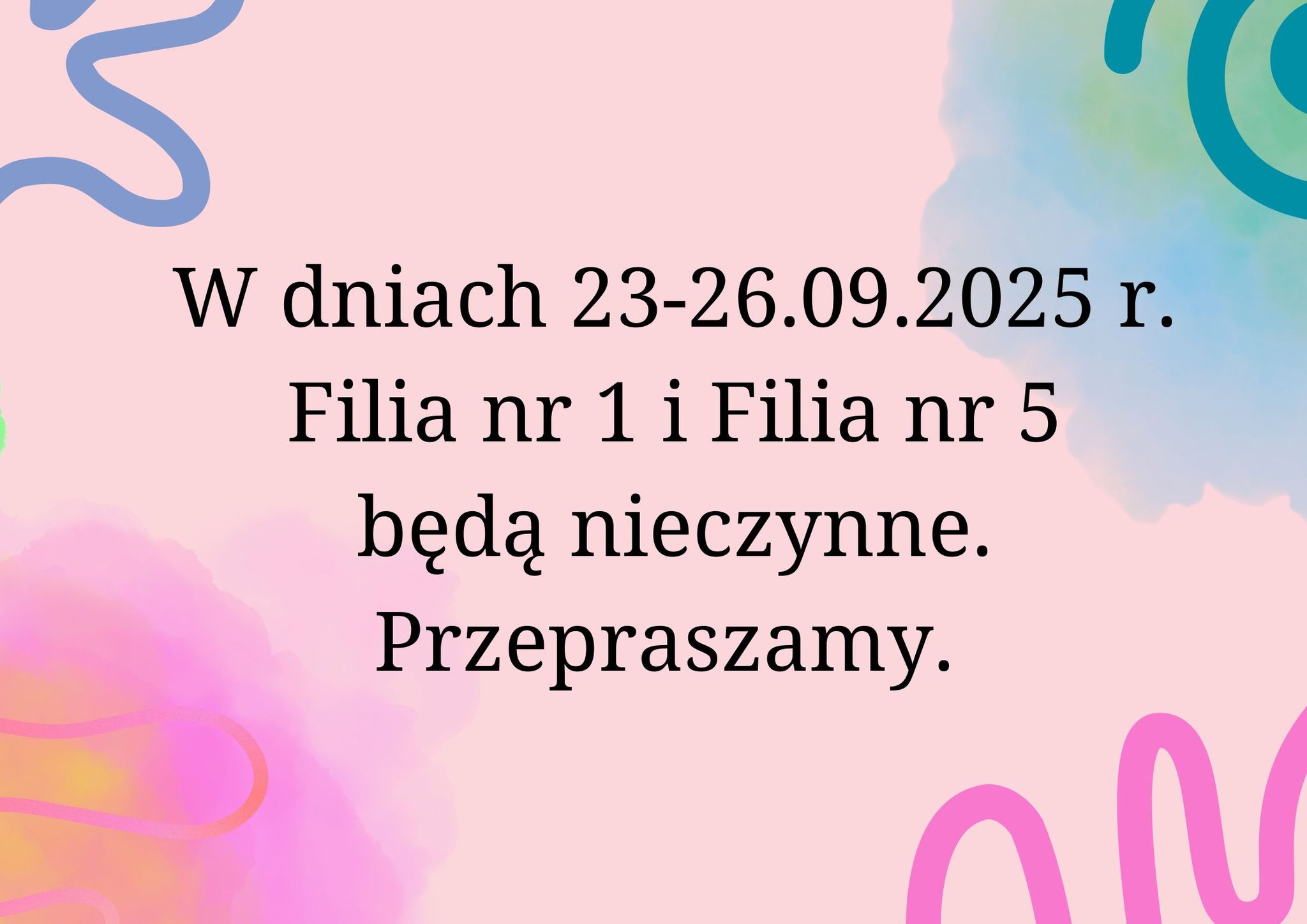 W dniach 23-26.09.2025 r. Filia Biblioteczna nr 1 i Filia Biblioteczna nr 5 będą nieczynne. Przepraszamy.