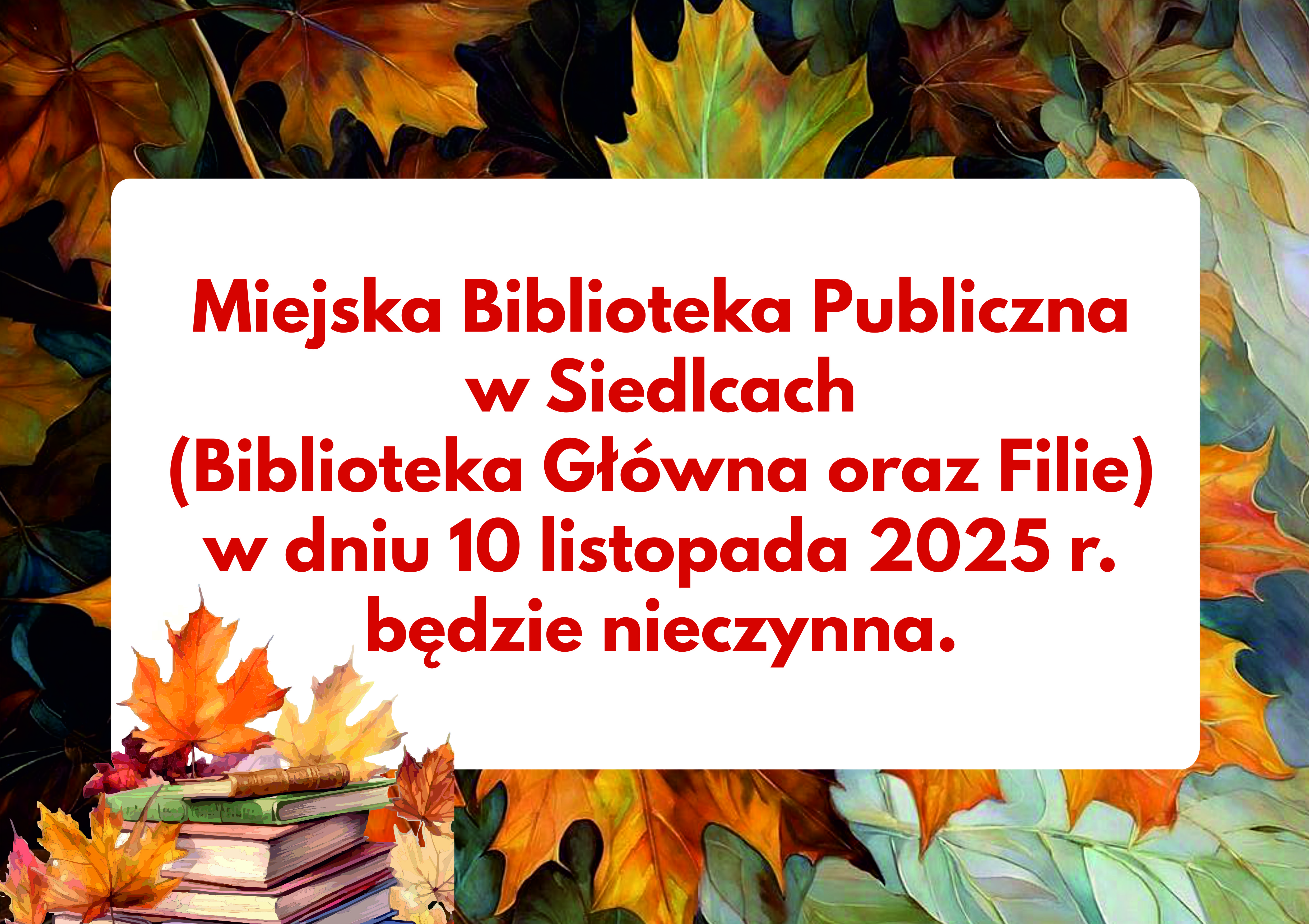 Miejska Biblioteka Publiczna w Siedlcach (Biblioteka Główna oraz Filie) w dniu 10 listopada 2025r.