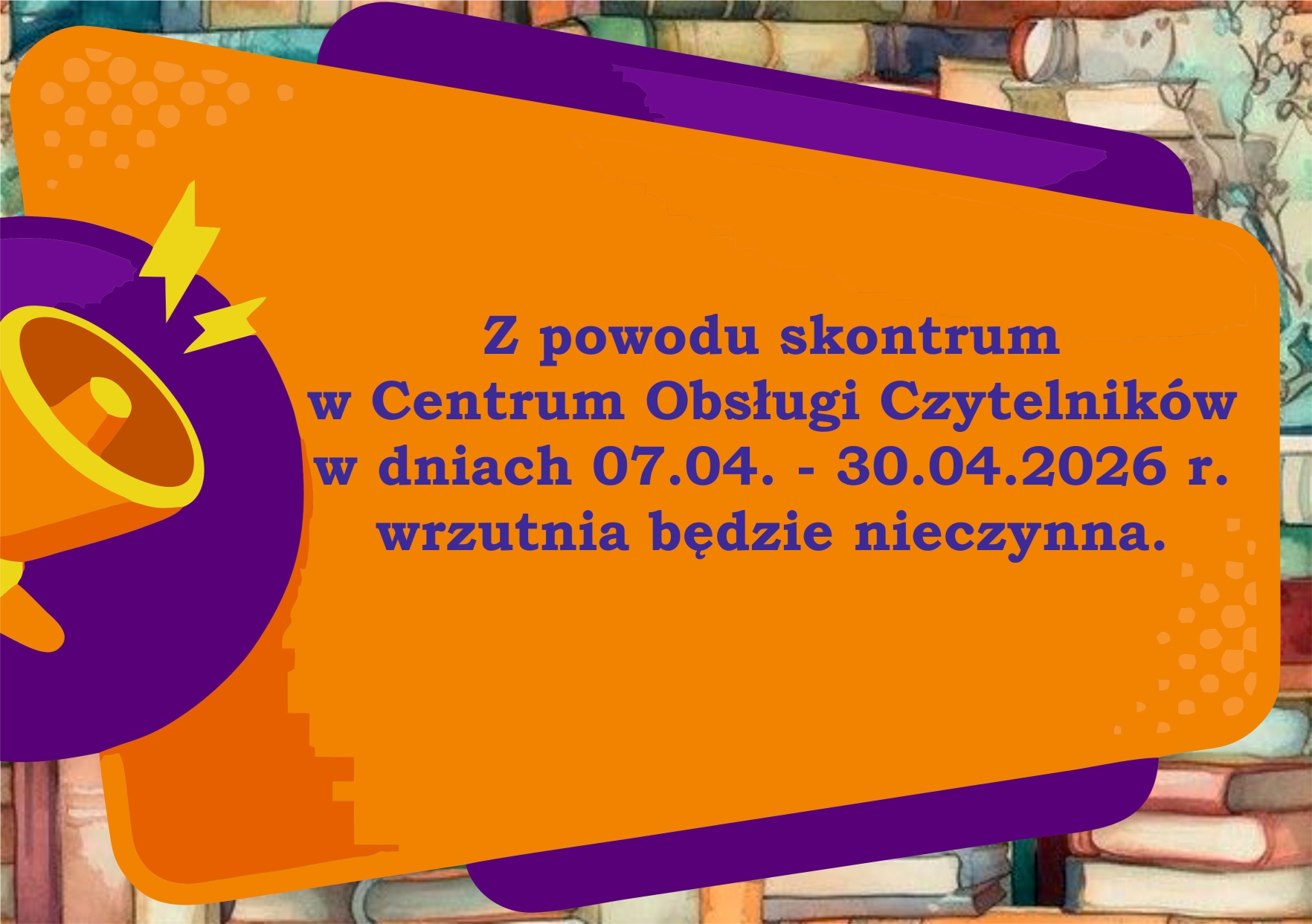 Z powodu skontrum w Centrum Obsługi Czytelników w dniach 07.04. - 30.04.2026 r. wrzutnia będzie nieczynna.