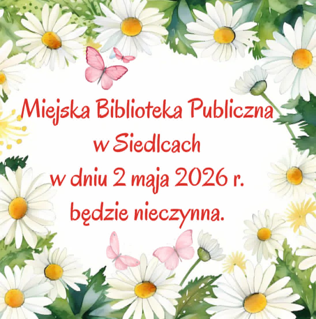Miejska Biblioteka Publiczna w Siedlcach w dniu 2 maja 2026 r. będzie nieczynna.